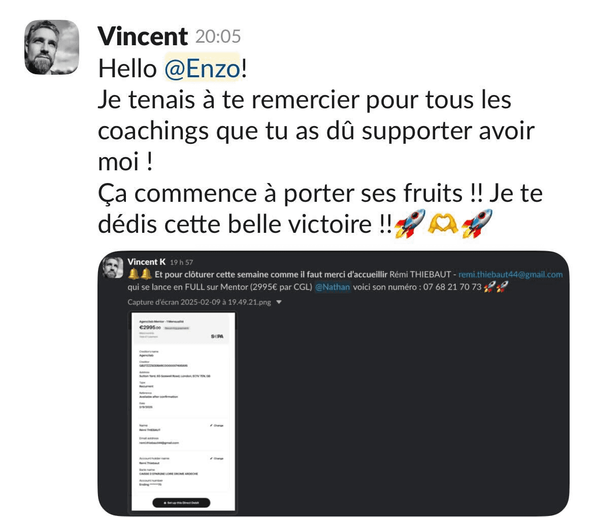 Tes coachs t’épaulent, décortiquent tes appels et te poussent en continu vers ton prochain palier de performance.